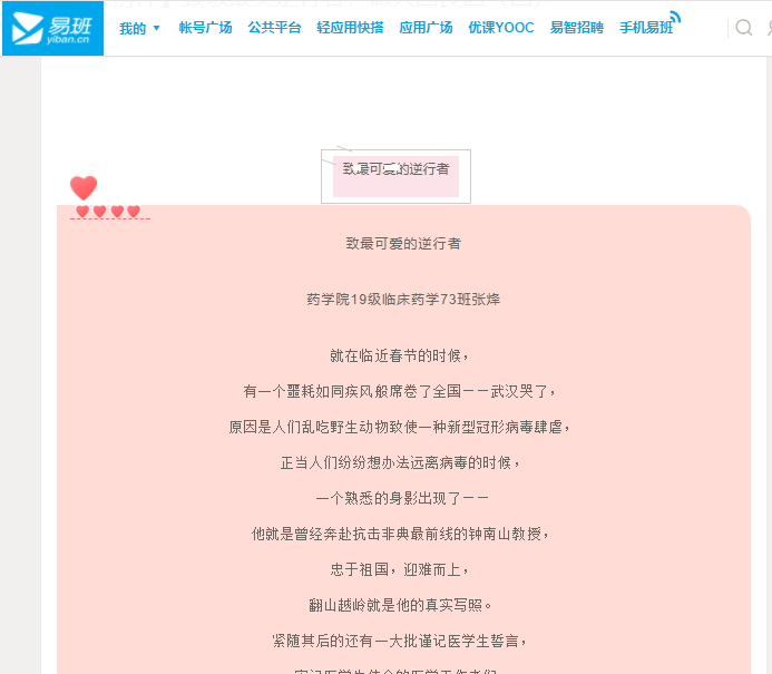 致敬最美逆行者,争做大国良医。我校学子们正用自己的行动致敬这个伟大的时代里这群最可爱的人,用自己的行动凝聚起强大的青春正能量,为武汉加油,为中国加油!他们的文字,情感真挚、抚慰人心又充满力量,我校现已择优在易班主页推出20余篇。征文活动还在火热进行中,学校易班主页将继续择优刊登。