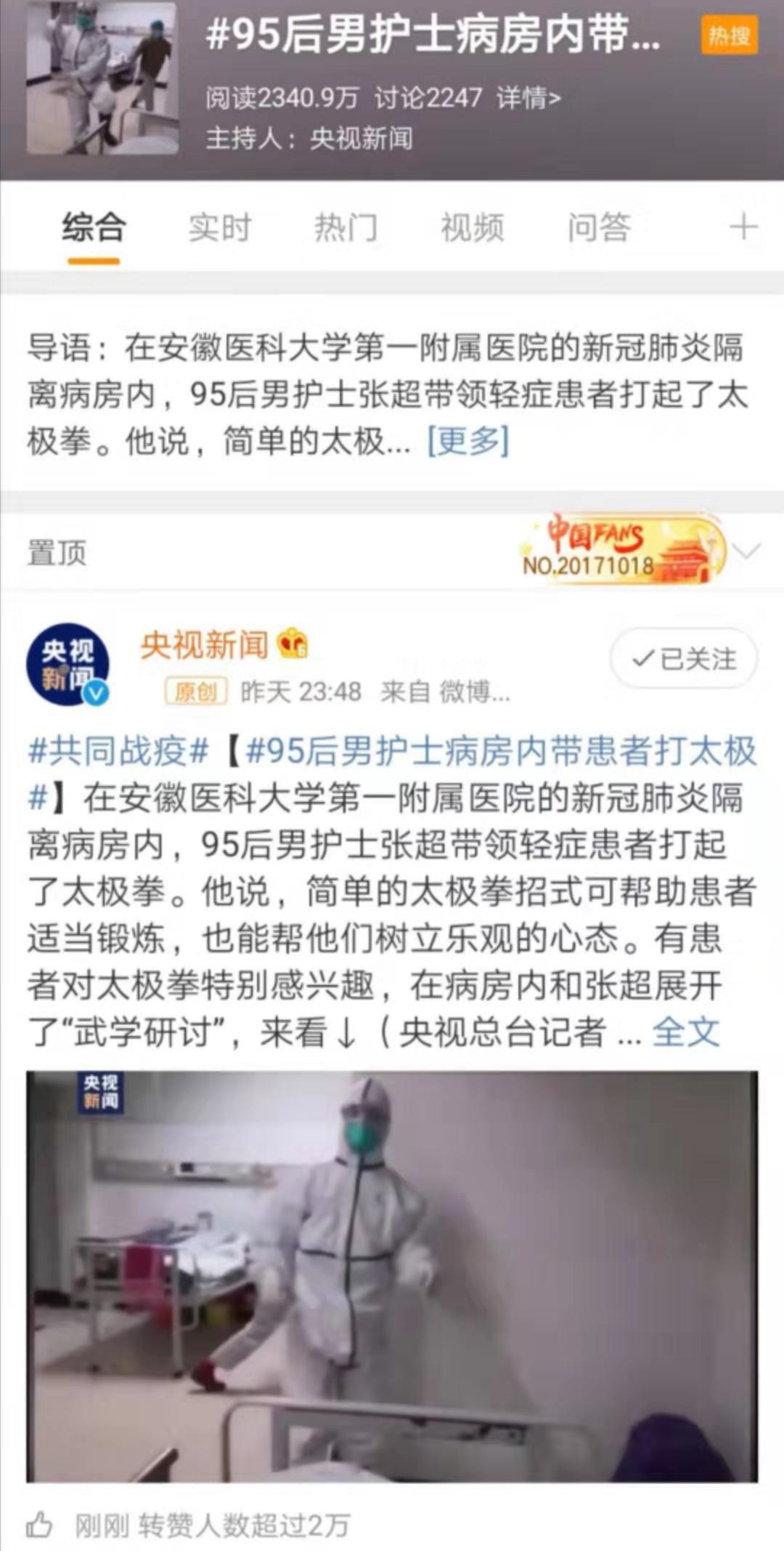 报道称:“已在隔离病房奋战十余天的张超,是一名太极爱好者,当晚他巡房时,即兴教患者打起太极拳,帮大家活动身体、放松心情。”