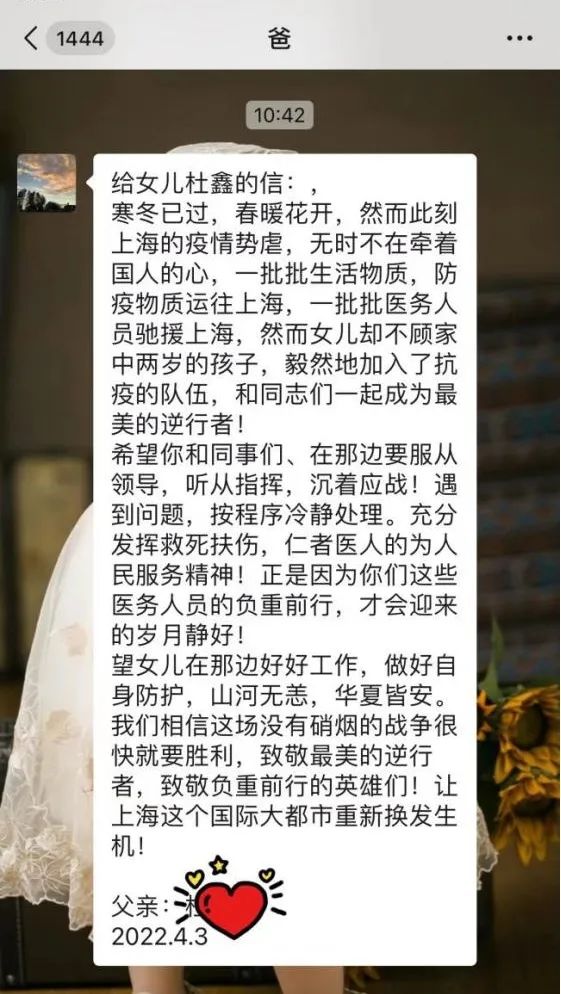 接到援沪任务时,我丝毫没有犹豫,迅速准备好生活用品,随时准备出发。临行前,我一直跟家里交代关于女儿的种种需要注意的事情,也就在走之前给父母发了个简短的微信,说是要去上海支援,估计不能及时接听电话,看到后会回复。