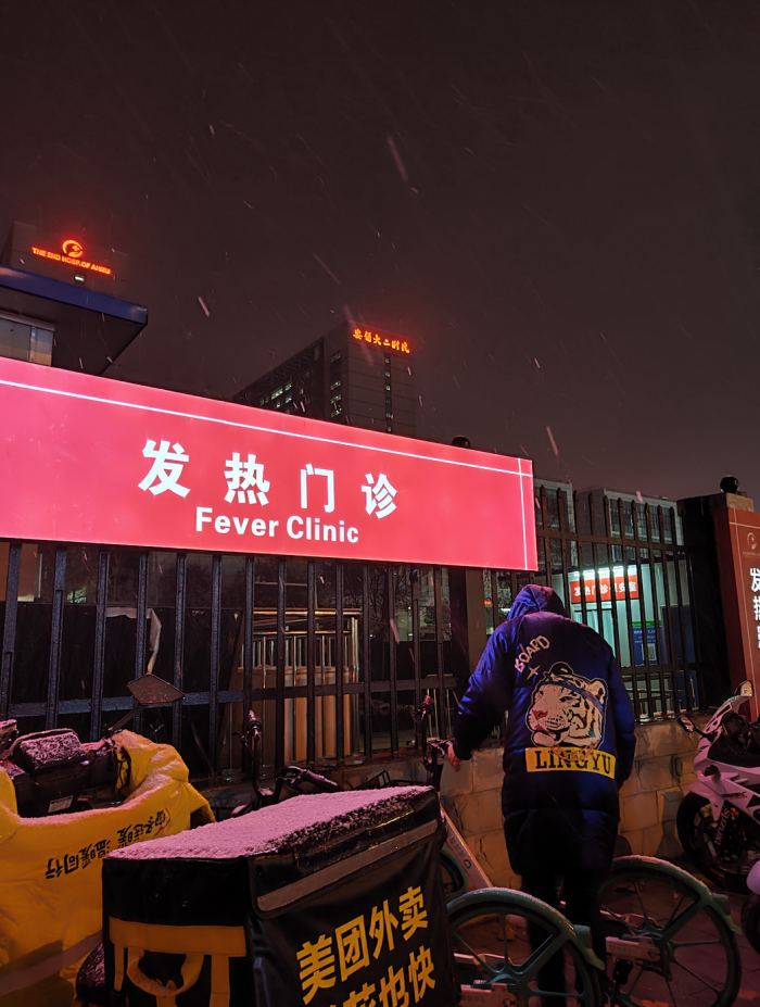 12月16日晚,合肥下起小雪,安医大二附院成人发热门诊外,一位患者看完病后正在离开