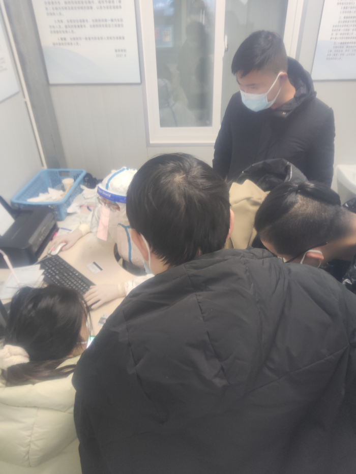 当天晚上,发热门诊共开设了四个诊室,四个当班医生负责接诊,他们在从下午4:00到凌晨12:00的8个小时马不停蹄地接诊,基本上不喝水吃东西,更抽不出时间上厕所。尽管这样,来就诊的患者还是源源不断,队伍从大厅和过道一直排到了门外,又继续向后面排出了六七十米长。