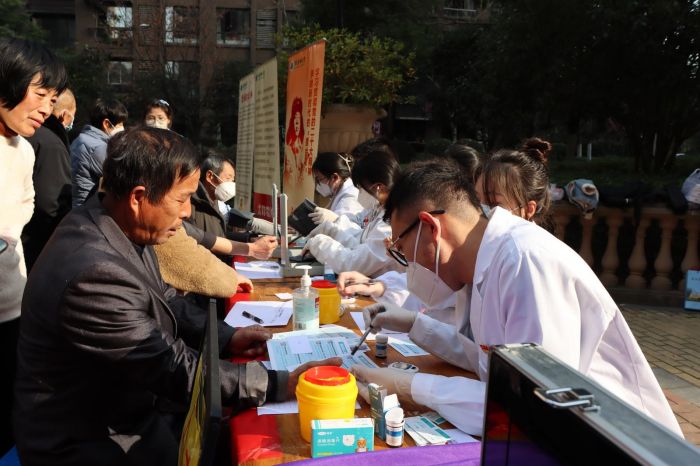 活动现场,前来参加义诊的居民络绎不绝。志愿者们热情引导居民有序排队等候,为他们提供血压测量、血糖检测等服务,并建立健康档案,登记居民的健康状况。